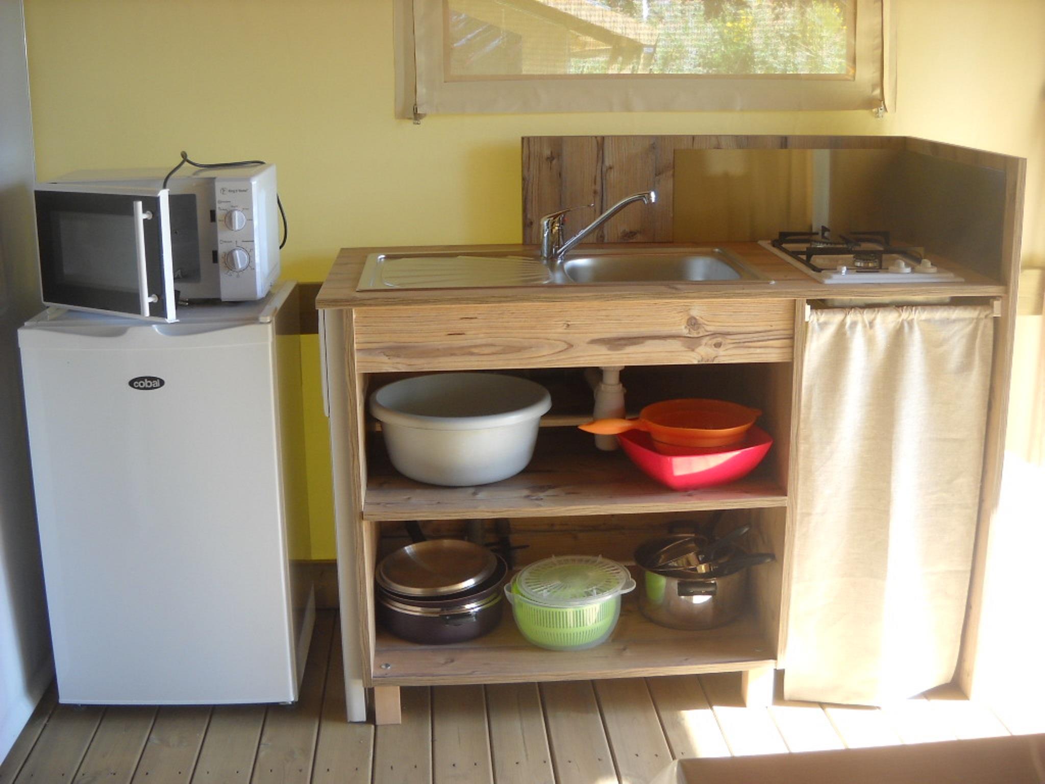 Cette tente spacieuse comprend deux chambres, avec un grand espace pour se détendre. La terrasse couverte de 8m² vous permettra de profiter des soirées en plein air, que ce soit pour un repas en extérieur ou simplement pour vous détendre après une journée d’aventure. Bien que cette tente n’ait pas de sanitaires ni de salle de bain, un bloc sanitaire moderne est à proximité pour plus de commodité.