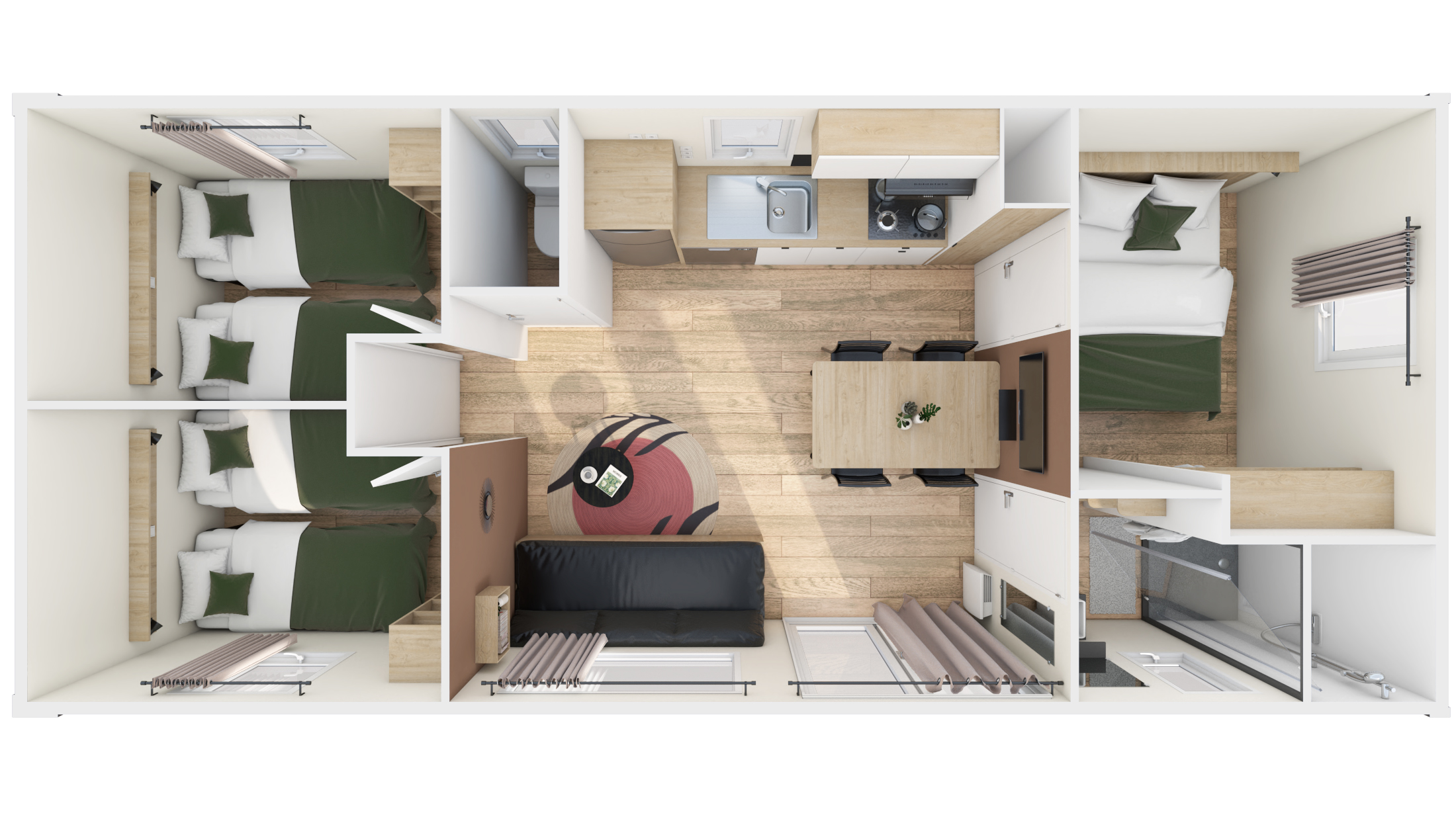 Pour votre séjour au Cap Finistère, notre Homeflower Premium 35m² est la location idéale. Pratique et confortable, vous y trouverez tous les équipements nécessaires pour un séjour haut de gamme réussi. Profitez d’une grande terrasse semi-couverte pour vous détendre en extérieur, d’un séjour lumineux avec télévision, et d’une cuisine entièrement équipée, incluant un lave-vaisselle pour plus de confort. Les 3 chambres spacieuses sont idéales pour toute la famille, et les draps ainsi que les serviettes sont inclus pour un confort optimal. La climatisation réversible assure un bien-être tout au long de l’année.